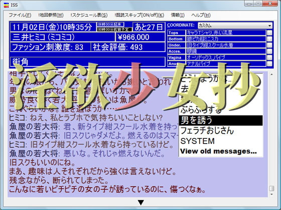 同人18禁ゲーム「淫欲少女抄」は、絵も音も無く文字だけで味わい渋いゲームです。女の子の身体になって、架空の街で2ヶ月間を過ごします。メニューを選ぶだけの簡単な基本操作。面倒な攻略は無く、息をするぐらい簡単にエッチ行為ができます。そこで何をするかはプレイヤー次第。アイテムは100種類以上。スク水だけで3種類。プレイの種類は細かく分けると400以上。エンディングは20種類以上。男とやるのも、レズに専念するのも、見られる快感に酔うのも、獣○やSMに浸るのも、女の子の身体で金儲けに専念するのも自由。やりやいことだけを、やりたいようにやろう!