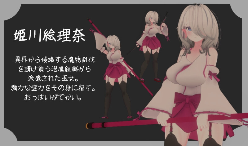 魔法が存在し、魔物が蔓延る異世界で退魔巫女の女の子「姫川絵理奈」が戦い、敗北したら犯されてしまう3Dアクションゲームです。